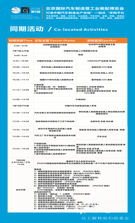展會將同期舉辦“全球汽車前沿技術發布會”、“汽車技術創新論壇”、“中國汽車易損件更換與保養”、“汽車智能工廠與機器人高峰論壇”等多場高水平的會議論壇。