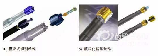 另一種模塊化的絲錐是不帶容屑槽的結(jié)構(gòu),應(yīng)用于擠壓絲錐,如圖7b)所示。與帶容屑槽的模塊化切削絲錐的接口類似,絲錐頭與刀桿也通過放射狀的多個三角棱結(jié)合。由于所有的三角棱都是長齒,它不但不會發(fā)生打滑現(xiàn)象,而且更有利于傳遞較高的扭矩。