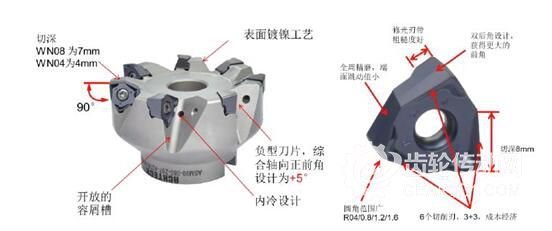 第三款是純的雙面銑刀ASM90-WN08銑刀。澳克泰介紹說,他們的ASM90-WN08銑刀是真正的90°主偏角,有疏齒、密齒和超密三種齒距(其中超密只推薦在短屑類材料及小余量銑削時應(yīng)用),有芯軸套式、圓柱柄、側(cè)固式和模塊式多種接口,刀盤表面鍍鎳,美觀且耐腐蝕,耐磨損,大部分直徑的銑刀盤還帶有內(nèi)冷卻系統(tǒng);而刀片是凸三角形的負型刀片,每個刀片帶有6個有效刃口,無論是FM2、MM3、MM4和MR2四種槽型中的哪一種都帶有短修光刃(另外還可選專用長修光刃刀片),可以獲得較高的粗糙度。刀片材質(zhì)則與AFM45-XN系列銑刀一樣,有2種帶有CVD涂層和4種帶有PVD涂層的刀片可供選擇。