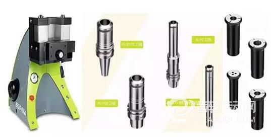 由于PG夾頭帶有1:100微小錐度,不借助工具我們無法將夾頭完全轉(zhuǎn)入刀柄,因此瑞格費克斯推薦用冷壓刀柄自動裝夾單元(圖4左),將手工初步套入的帶有刀具的夾頭和刀柄一同放入自動裝夾單元,由自動裝夾單元使用約15.5MPa(155Bar)的壓力負責將夾頭壓入刀柄。