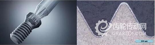 圖26右是加工中心鑄鐵專用絲錐,適用于在加工中心上以較高的切削速度(可達30~35m/min)加工材質(zhì)為鑄鐵類(包括灰口鑄鐵、球墨鑄鐵、蠕墨鑄鐵)的發(fā)動機缸體、缸蓋的內(nèi)螺紋加工。據(jù)成量介紹,相比普通絲錐,鑄鐵專用絲錐有轉(zhuǎn)速高、壽命長、剛性好、穩(wěn)定性好等特點,其性價比優(yōu)于國外品牌同類型絲錐。