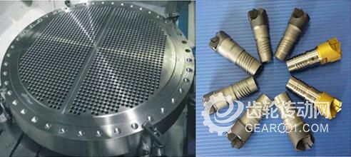 孔深度與孔徑比較大(一般≥10,甚至可達100以上,核電產(chǎn)品中深度和孔徑比可≥ 50),鉆桿細,鋼性差,工作時容易產(chǎn)生偏斜和振動,孔精度及表面質(zhì)量難以保證;切屑量大而排屑通道長,若斷屑不好,堵屑鉆頭損壞,孔加工質(zhì)量難以保證;鉆頭在近似封閉情況下工作,工作時間長,熱量不易排出,鉆頭極易磨損。而工研所開發(fā)的Φ16.28-Φ25.35等多種規(guī)格的管板鉆,在核電、鍋爐、化工行業(yè)的管板加工試驗取得了較好的效果。