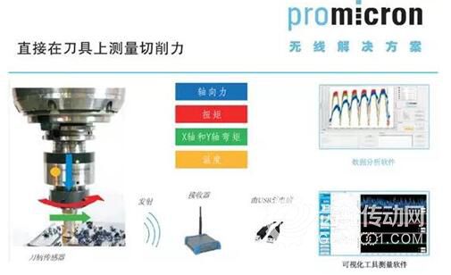 德國pro-micron公司是一家專注于工業(yè)無線解決方案的公司,SPIKE是其無線動態(tài)切削力測量系統(tǒng)產(chǎn)品(圖31),它創(chuàng)新性地將傳感器安裝于刀柄上,直接在加工過程中將測量的動態(tài)切削力(軸向力,扭矩和彎矩)數(shù)據(jù)無線實時地傳輸?shù)诫娔X,獨一無二地用更敏感的彎矩作為切削力主要指標,并用專利的極坐標圖形來表現(xiàn)彎矩的實時變化,可以直觀看到每個切削刃的實時狀態(tài)。