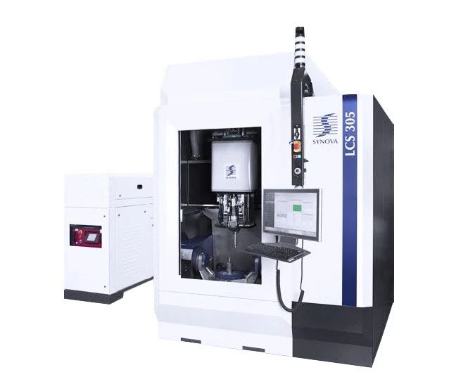 南京中科煜宸激光技術(shù)有限公司LCS305水導(dǎo)激光加工設(shè)備(瑞士SYNOVA 公司)。X/Y/Z軸行程500/380/380mm,A軸行程+135°~-20°,C軸行程360°,工作容積(H×Φ)為260×Φ130mm。采用直線電機(jī)和力矩電機(jī)驅(qū)動(dòng),礦物鑄造床身,溫度控制范圍為±0.1℃,全自動(dòng)偏移校準(zhǔn)系統(tǒng)集成了激光噴嘴校準(zhǔn)、自動(dòng)射流角度校正、激光功率計(jì)和接觸式探針。切割面光滑,邊緣鋒利Ra≤0.2,柱形激光實(shí)現(xiàn)平行切口(無V形),加工精度為±0.005mm。解決了干式激光器的熱損傷、微裂紋、碎屑沉積、錐度和精度不足等問題。專為自動(dòng)生產(chǎn)大尺寸刀具、多齒金剛石刀具以及其他3D加工而設(shè)計(jì)的激光微射流LMJ加工系統(tǒng)。激光微射流加工系統(tǒng)提供了激光實(shí)現(xiàn)全反射的媒介,保持平行水射流中的激光束完全平行,冷卻被加工材料消融后的加工面,同時(shí)將激光加工后的廢屑帶走,保證了加工面質(zhì)量。
