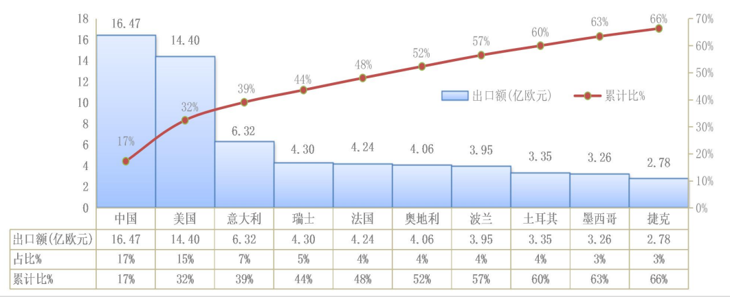 2023年德國對中國的機床出口額達16.47億歐元,出口額占比最高,達17%,同比增長6%。受疫情影響,2020年德國對中國機床出口降至谷底,目前正在逐步恢復中。