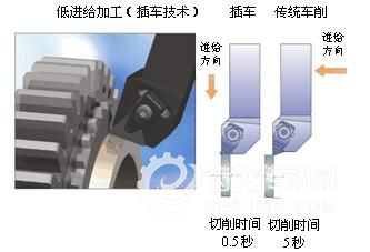插車(chē)的主要好處在于縮短了加工節(jié)拍。插車(chē)的進(jìn)給量為0.04mm/rev 、切削深度在4轉(zhuǎn)加上極小的空進(jìn)給,共計(jì)接觸時(shí)間0.04秒內(nèi)完成,而傳統(tǒng)車(chē)削需要4.96秒,差距超過(guò)100倍。