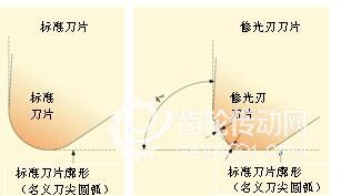 修光刃技術(shù)在硬質(zhì)合金刀具中已經(jīng)進(jìn)行很多的嘗試和試驗(yàn)。使用修光刃刀片的優(yōu)勢(shì)是在更高得進(jìn)給量下的加工能力。修光刃的原理如圖3所示。實(shí)際上修光刃的原理就是在刀尖圓弧之后放置一個(gè)大圓弧或多個(gè)大圓弧。由于接觸區(qū)域更寬且能縮小硬車(chē)削生成表面的波峰和波谷的比值,這使得刀片具有與大圓弧或圓刀片相同的效果。這也使得進(jìn)給量增加后表面粗糙度不會(huì)變差。