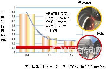 除了加工節(jié)拍提高之外,插車(chē)還有其它好處。圖6表示刀尖圓弧半徑對(duì)表面粗糙度的總體影響。如期望的那樣,刀尖圓弧半徑越大,表面粗糙度越好。令人感興趣的是,與傳統(tǒng)加工相比,插車(chē)通常產(chǎn)生好得多的表面粗糙度。