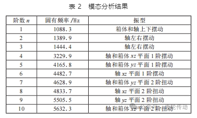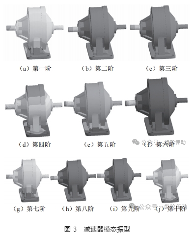 本文利用 workbentch 的模態分析法,考慮行星減速器在無載荷情況下的固有頻率特性。將模型導入模態分析模塊,使用系統自動化劃分網格。由于模態分析不需要加載荷,故只需要給減速器底座 4 個螺栓孔加載固定約束,再分析設置選擇提取前 10 階模態,計算后結果如表 2 所示。