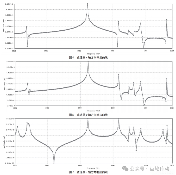 根據計算的減速器固有頻率,設置諧響應分析響應頻率,加載外部激勵為軸向轉矩,計算減速器在各級頻率下的響應曲線,并查看最大響應頻率。圖 4、圖 5 和圖 6 分別為減速器在 x 軸、y 軸和 z 軸的響應曲線,在第 4 階頻率達到 3229.9Hz 時,減速器在 xyz 軸都有最大響應;在 z 軸由于有切向轉矩的作用,在 5 階高頻 4165.8Hz 時也產生了最大響應。這和模態分析結果基本一致,在 4 階頻率下減速器表現為整體的左右擺動,因此 3 個方向都有響應;而在 5 階頻率下表現為軸的上下擺動,箱體有小擺動,因此在z方向有最大響應,而 xy 方向響應沒有達到最大。