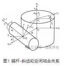 為保證蝸桿-斜齒輪的連續穩定傳動,蝸桿和斜齒輪嚙合首先要滿足嚙合基本條件:(1)蝸桿法向模數和法向壓力角與斜齒輪法向模數和法向壓力角分別相等;(2)蝸桿導程角和斜齒輪螺旋角相等;(3)蝸桿和斜齒輪旋向相同。以上 3 個條件是齒面的幾何參數設計的基本條件,滿足這些條件并不能保證傳動的連續進行。在傳動過程中,蝸桿和斜齒輪還可能發生齒面接觸干涉。為了分析蝸桿與斜齒輪之間的傳動關系,首先需要建立空間嚙合坐標系,作為蝸桿和斜齒輪的空間嚙合運動模型。