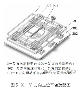 測針定位組件由 X 方向定位平臺3和Y 方向定位平臺5組成,它們分別作為第一層和第二層安裝在旋轉底座的下方,通過高精度滾珠絲杠完成直線運動。各定位平臺主要由滑動導軌與滾珠絲杠裝配而成。在 Y 方向定位平臺上安裝了聚焦定位攝影機,其鏡頭對準針尖加工表面,用于觀測定位垂直激光束光斑的落點位置。X、Y 方向定位平臺裝配圖見圖5。