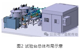 試驗(yàn)臺工作原理:被試滑油泵采用高速電機(jī)直驅(qū)工作,各分系統(tǒng)分別實(shí)現(xiàn)主、副油箱高空環(huán)境(壓力)模擬、滑油溫度控制、滑油系統(tǒng)管路壓力調(diào)節(jié)和工作環(huán)境溫度模擬,滿足被試泵入口、出口介質(zhì)壓力、溫度要求,模擬被試滑油泵工作環(huán)境,完成被試泵的性能測試。圖2為試驗(yàn)臺總體布局。