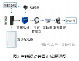 試驗(yàn)臺主軸驅(qū)動裝置(或稱主軸驅(qū)動系統(tǒng))為被試滑油泵提供轉(zhuǎn)速連續(xù)可調(diào)的主軸驅(qū)動力,主軸驅(qū)動系統(tǒng)采用大功率高速電機(jī),采用直驅(qū)方式,無機(jī)械變速結(jié)構(gòu)(圖 3)。主軸額定輸出功率為 65kW,可實(shí)現(xiàn)旋轉(zhuǎn)速度0~15000r/min連續(xù)可調(diào);且主軸正反轉(zhuǎn)可調(diào),由軟件設(shè)置,實(shí)現(xiàn)無級調(diào)速(變頻調(diào)速)并測速。配備變頻調(diào)速器和測速系統(tǒng),實(shí)現(xiàn)無級調(diào)速和測速。主軸轉(zhuǎn)速在 3000r/min 以下控制精度 ±5r/min,3000~12000r/min 之間控制精度±10r/min,12000r/min 以上控制精度±20r/min;自動控制狀態(tài)下,15 秒以內(nèi)穩(wěn)定到目標(biāo)轉(zhuǎn)速。