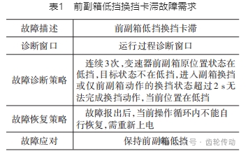 變速器箱體受潤滑油質量、零部件損壞等因素影響,可能出現換擋卡滯問題,導致無法正常換擋,進而影響車輛行駛。限于篇幅,本文以 AMT 前副箱低擋換擋卡滯故障為例,設計自動化序列并開展測試。前副箱低擋換擋卡滯故障需求如表 1 所示。