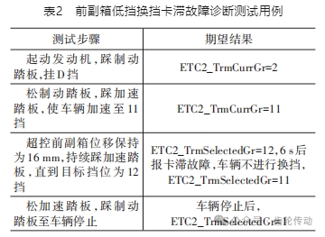 該 12 擋 AMT 奇數擋位時前副箱為低擋。由于高擋位時車速較高,換擋卡滯造成的危害加劇,本文以 11 擋時前副箱低擋換擋卡滯為例,故障診斷測試用例如表2所示。其中,ETC2_ TrmCurrGr 為當前擋位,ETC2_TrmSelectedGr 為目標擋位。