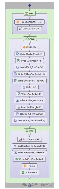 該序列由開始(Start)、流程(Group)和結束(END)3 個部分組成,分別為上電和開啟模型數據記錄、故障診斷測試流程、記錄和分析數據。其中,clib 文件為封裝好的通用測試序列庫,可以被多個測試序列反復引用。上電(起動發動機).clib包含上電流程、起動發動機和確認TCU屬于默認初始狀態測試,下電 .clib 包含下電流程和重置 TCU 狀態測試,掛 D 擋 .clib 為掛入 D 擋測試。Script Block 為 Python 腳本,用于判定變速器前副箱在低擋是否持續6 s無法摘出(即故障診斷判斷時間)。