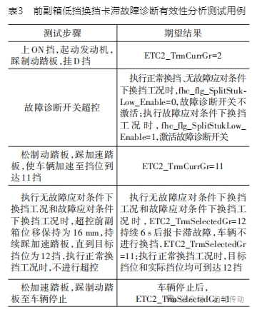 搭建高速行駛工況下正常換擋、無故障應對條件下換擋和故障應對條件下前副箱低擋換擋3種工況,不同工況下的測試用例如表 3 所示。其中,fhc_flg_SplitStukLow_Enable為前副箱低擋換擋卡滯故障開關標定值。