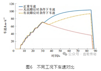 不同工況下車速、當前擋位和目標擋位對比結果如圖 6所示。由圖 6可知:正常換擋工況下,由于換擋離合器脫開等原因,車輛在由11擋升12擋時,車速先下降一段后持續正常提高;無故障應對條件下換擋工況中,在由11擋升12擋時,卡滯原因導致無法正常換擋,車速持續降低,無法回到原有加速狀態,將導致車輛最終停止;在故障應對條件下,車輛在經過 6 s的故障診斷時間后,車速雖然降低,但可以恢復到原有加速狀態,之后車速變化趨勢與正常換擋工況類似。