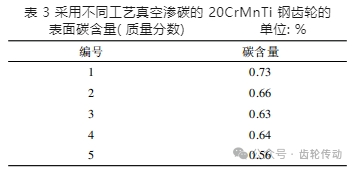 采用 EPMA-1720 電子探針按 GB /T 15074—1994《電子探針定量分析方法通則》測定齒輪節圓處的表面含碳量。表 3 為采用 5 種工藝真空滲碳的齒輪表面以下 0.1 mm 處的含碳量。表 3 數據表明,按 1 號工藝真空滲碳的齒輪表面含碳量最高。