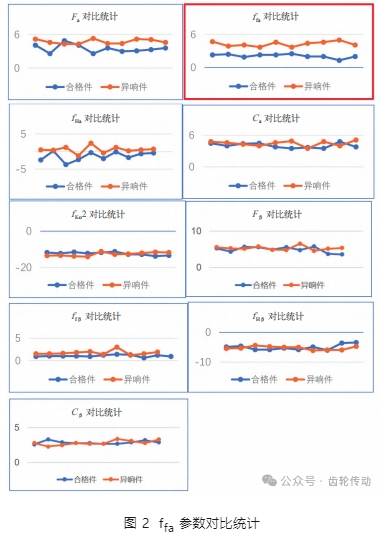 ffa 是齒形形狀偏差,用以評價齒形平滑程度,數值越小,越平滑,精度越高。針對評價齒形齒向的 9 項參數,“異響件”與“合格件”各選 10 件,進行對比。可以看到ffa 參數存在明顯差異,如圖 2 所示。