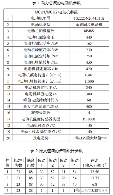 下面以某一款電動(dòng)重卡動(dòng)力總成產(chǎn)品試驗(yàn)型號為例,通過基于整車最佳工況效率的匹配要求,主動(dòng)避開動(dòng)力總成結(jié)構(gòu)的共振區(qū)間,合理設(shè)計(jì)優(yōu)化變速箱的擋位速比和電動(dòng)機(jī)電磁設(shè)計(jì),使整個(gè)動(dòng)力總成在滿足整車動(dòng)力性能要求和減速箱速比基本不變的情況下,通過調(diào)整齒輪的齒數(shù),達(dá)到基于整車工況的動(dòng)力總成效率提升、成本的最優(yōu)設(shè)計(jì)和 NVH 的最佳狀態(tài)表現(xiàn)的工程開發(fā)實(shí)踐目的。
