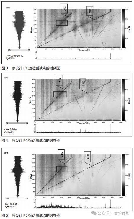 因?yàn)閯?dòng)力總成是雙電動(dòng)機(jī)、雙中間軸變速箱的對稱結(jié)構(gòu)設(shè)計(jì),振動(dòng)特性差異不大,所以試驗(yàn)選取了 P1、P4、P5 三個(gè)測點(diǎn)的振動(dòng)信號進(jìn)行分析,重點(diǎn)分析電動(dòng)機(jī)從 0 ~ 11000r/min 的 P1、P4 及 P5 振動(dòng)測試點(diǎn)升速過程瀑布圖,3 個(gè)測點(diǎn)的振動(dòng)瀑布云圖(時(shí)頻圖)分別如圖 3、圖 4、圖 5 所示。
