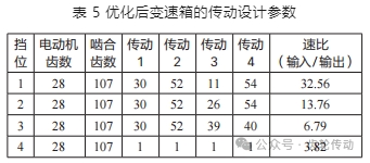 把電動(dòng)機(jī)齒數(shù)換為 28 齒進(jìn)行測試,為了保證速比沒有太大變化,嚙合齒數(shù)換成 107 齒,優(yōu)化變速箱的傳動(dòng)設(shè)計(jì)參數(shù)變速箱參數(shù)如表 5 所示。