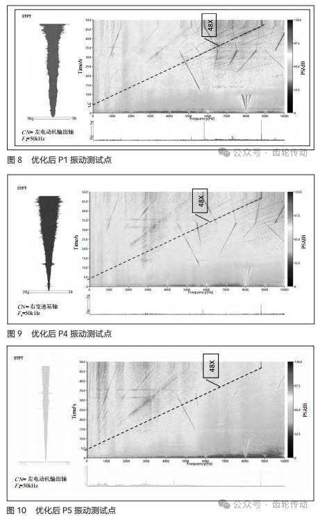 為了驗(yàn)證上述減速箱優(yōu)化設(shè)計(jì)的效果,把換齒后動(dòng)力總成在臺(tái)架上復(fù)測上訴同條件的加速測試。試驗(yàn)依然選取了 P1、P4、P5 三個(gè)測點(diǎn)的振動(dòng)信號進(jìn)行對比分析。換齒后的動(dòng)力總成從 0 ~ 11000r/min 的 P1、P4 及 P5 振動(dòng)測試點(diǎn)升速過程瀑布圖分別如圖 8、圖 9、圖 10 所示。