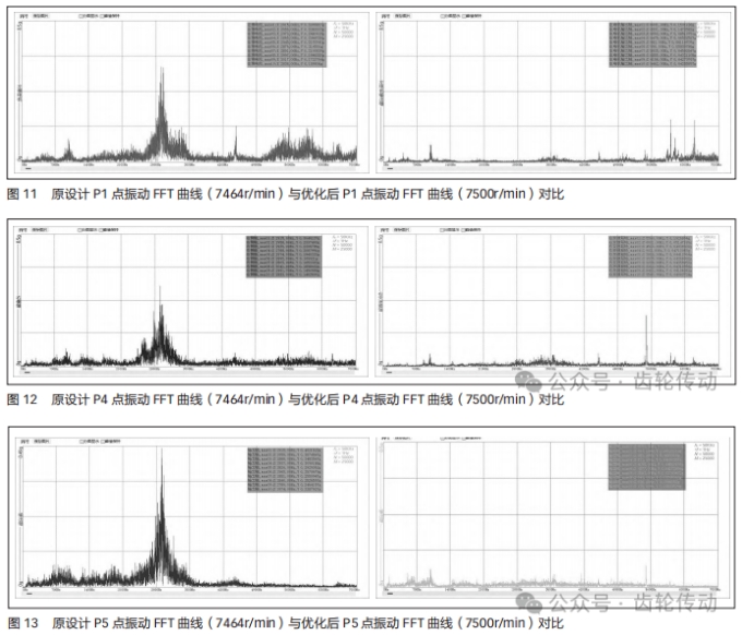 為了驗(yàn)證減速箱設(shè)計(jì)優(yōu)化后在 7000 ~ 8300r/min 轉(zhuǎn)速區(qū)間的振動(dòng)抖動(dòng)情況是否有改善,本文對 7500r/min 時(shí)刻 P1、P4、P5 三個(gè)測點(diǎn)對應(yīng)的 FFT 曲線進(jìn)行優(yōu)化前后對比,分別如圖 11、圖 12、圖 13 所示。