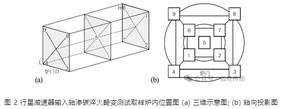 此外還要求,馬氏體、殘留奧氏體、碳化物和心部組織級別均為 1 ~ 2 級,齒輪精度要求達到 JISN3 級 ( JIS B1702) ,齒溝振動≤0.028 mm,齒形、齒筋變形量 ≤0.015 mm。圖 2 為該輸入軸滲碳淬火畸變測試取樣爐內位置圖。