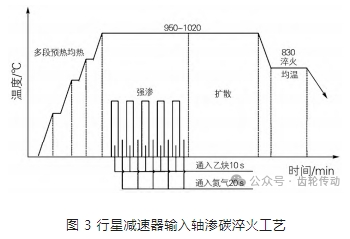 試驗裝備為國產雙室真空低壓滲碳高壓氣淬真空爐,滲碳淬火工藝如圖 3 所示。在升溫階段,爐內真空度控制在1 Pa 以下,依次將工件升溫至(300 ±5) ℃,均溫 30 min; 升溫至(480 ± 5) ℃,均溫 30 min; 升溫至 (680 ± 5) ℃,均溫 30 min; 升溫至(780 ± 5) ℃,均溫 30 min; 升溫至(850 ±5) ℃,均溫 30 min; 升溫至 950 ℃, 經過多段升溫和均溫后進行滲碳。
