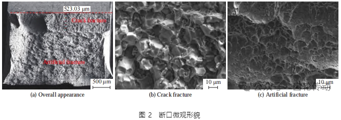 沿裂紋處打開,在掃描電鏡下觀察斷面,形貌如圖 2 所示。由圖 2 可見,裂紋斷面與人工斷口界限明顯,形貌差異明顯,裂紋深約 0.52 mm。裂紋斷面大致與零件表面垂直,斷口整體干凈,呈沿晶形貌,未見變色、腐蝕等跡象(圖 2a);人工斷口呈明顯的韌窩特征(圖 2b),兩部分斷口。