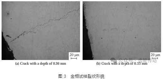 垂直于裂紋制取橫向金相試樣(切取圖 1b 中虛線標識截面),可觀察到 2 條裂紋,其延伸方向均大致與試樣表面垂直。兩裂紋均呈沿晶擴展特征,兩側未見氧化、脫碳及腐蝕現象。其中一條裂紋由試樣表面向內部延伸,長度為 0.36 mm(圖 3a);另一條則位于試樣內部,未在表面開口,長度為 0.33 mm(圖 3b)。