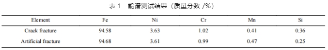 對裂紋斷面和人工斷口表面進行能譜測試,結果見表 1。材料成分符合 18CrNi4A 的技術要求,斷口表面除基體元素外,未見其他異常元素。
