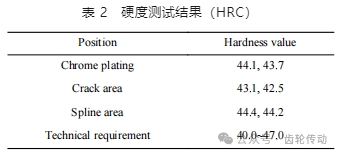 在金相試樣上對鍍鉻區心部、裂紋區域、花鍵區域分別進行顯微硬度測試,按 GB/T 1172— 1999 將維氏硬度轉換成洛氏硬度,結果見表 2。可見各區域硬度差別不大,符合技術要求。