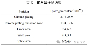 對零件鍍鉻區、鍍鉻過渡區、裂紋區、焊接區和花鍵區分別取直徑為 1 的試樣,使用氫分析儀測試氫含量,結果見表 3。
