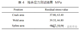 分別對故障件內孔槽裂紋區、焊接區以及花鍵區進行殘余應力測試,結果見表 4。可見零件該區域均為殘余拉應力。