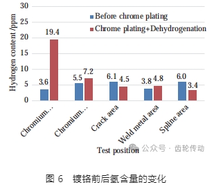 在鍍鉻工序前后分別對零件不同區域的氫含量進行測試,結果見圖 6。