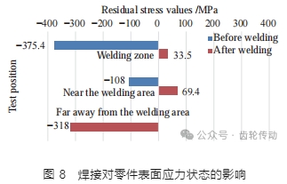 慣性摩擦焊工序前后,分別對零件焊接區域及其附近進行表面殘余應力測試,結果見圖 8。由圖 8 可知,經焊接工序后,焊接區域及其附近表面應力狀態均由壓應力轉變為拉應力;而遠離焊接位置的區域表面殘余應力值與焊接前相當,未發生明顯變化。因此,焊接后若殘余拉應力消除不及時或不徹底,都會對零件后續應力狀態產生不利影響。
