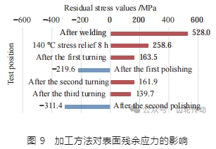 對零件的焊接區域在經歷焊接、消除應力、車削加工以及拋光工序后,分別進行表面殘余應力測試,結果見圖 9。由圖 9 可知,焊接工序后的表面拉應力達到最大值 528.0 MPa;消除應力工序后,拉應力明顯降低至 258.0 MPa,說明消除應力工序可有效降低零件應力水平。每次車削工序后,零件表面應力狀態約為拉應力 150.0 MPa。零件僅在每次經歷拋光工序后,表面應力狀態由拉 應力轉變為壓應力,表明拋光工序可有效改變基體表面應力狀態,預防氫脆現象的發生。