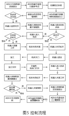 柔性機加生產線的生產起始于 ERP 系統下達訂單任務,MES系統接收并解析訂單詳情,結合產線設備狀態、物料庫存等實際情況 進行生產計劃排程。排程信息下達至自動上下料系統的控制程序后,由 PLC 控制程序的邏輯判斷、運動控制、通信等不同模塊與 MES系統協同完成上下料的動作過程。本文根據柔性機加生產線自動上下料系統的具體動作過程,制定了相應的控制流程,如圖5所示,并基于此設計控制系統硬件架構、IO 接口分配以及控制程序。
