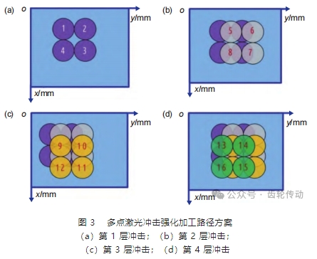 對被沖擊區域的強化需要進行 4 層沖擊覆蓋,第 1 層沖擊按照圖 3(a)所示,其中 1、2、3 和 4 表示激光沖擊強化順序,即先對位置 1 進行沖擊強化,之后激光光束沿著 y 軸正向移動一個光斑直徑(2.2 mm)距離,再對位置 2 進行強化,依次進行。在第 2 層沖擊中,其光斑的移動路徑與第 1 層相同,唯一區別在于起始點位置相對于第 1 層起始點來說,光斑沿著 y 軸正向偏移光斑半徑距離。類似地,第 3 層與第 4 層沖擊中,光斑移動路徑與上一層均相同,區別還是在于起始點偏移光斑半徑距離。