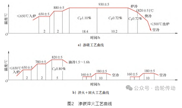 滲碳淬火工藝曲線如圖2所示。通過滲碳淬火工藝參數優化,控制加熱溫度、保溫時間和冷卻速度等,可以有效防止零件的形變,并提高產品質量的穩定性。