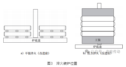 改進前采用支撐墊塊3點支撐齒輪水平裝卡,改進后的淬火裝爐方式采取高蓄熱、高載荷壓淬工裝,利用3倍齒輪有效截面厚度的載荷重量壓力淬火來控制端面淬火畸變,同時控制零件淬火過程中整個橫截面的相變溫度均勻變化,從而使組織轉變均勻,減小組織應力對淬火變形的影響,利用該工裝進行壓力淬火,將原有單件平鋪3點支撐淬火改為單爐壓淬4件進行淬火。