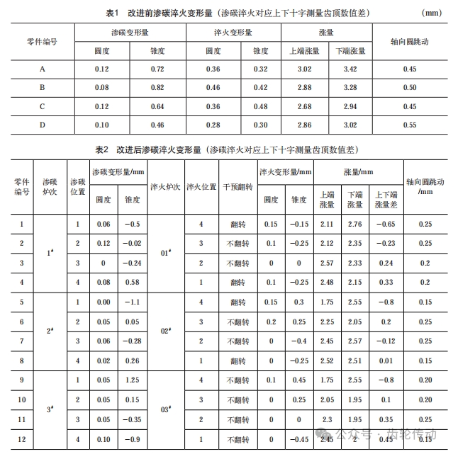 在工藝改進前,對零件編號A~D的工件進行平裝淬火,檢測滲碳淬火變形量,結果見表1。工藝改進后,對零件編號為1~12的工件進行壓力淬火,檢測滲碳淬火變形量,結果見表2。從表1和表2可看出,工藝改進前后工件的滲碳變形量、淬火變形量、漲量及軸向圓跳動參數變化較大,可以明顯觀察到壓力淬火后工件的漲量及軸向圓跳動控制有極大改善,同時發現壓力淬火不同位置方向的淬火漲量不同。