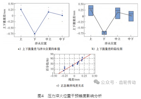 圖4所示為采用壓淬方式下,垂直方向不同壓力淬火位置對錐度影響分析。由圖4可發現,其最下端齒輪錐度差異量大,且上下端變形差異度與上中部3件齒輪相反,可利用此規律合理改善滲碳錐度差異齒輪進行裝卡配爐,有效彌補滲碳錐度變形,最終改善齒輪變形量。