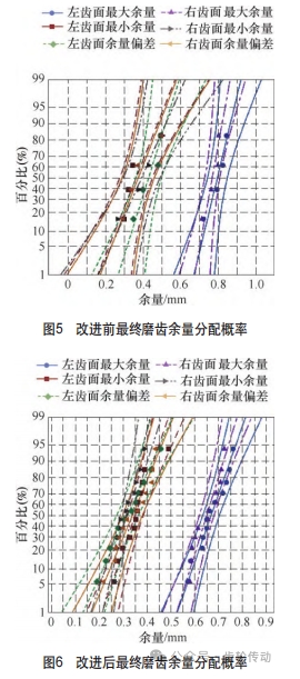 改進前后最終磨齒余量分配概率如圖5、圖6所示。從圖5、圖6可看出,改進后左右齒面最大磨削余量顯著降低,同時左右齒面磨削余量差異度明顯減小,確保了磨削余量滿足觸角的情況下減小磨削燒傷的可能性。