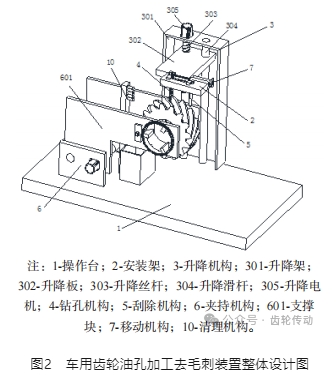 常見的齒輪油孔由于待加工齒輪的尺寸規(guī)格不同,油孔尺寸以及加工深度、加工精度要求也不同,因此加工時需考慮加工過程的裝夾機(jī)構(gòu)的通用性和加工尺寸的適應(yīng)性,刀具的轉(zhuǎn)速、進(jìn)給速度需實(shí)現(xiàn)無極調(diào)速。同時,需考慮加工效率問題,油孔毛刺的去除工藝需在油孔加工完畢后自動高效去除并且該機(jī)構(gòu)的設(shè)計具備滿足不同孔徑和深度的孔的毛刺去除功能。因此,油孔加工裝置針對上述工藝問題而設(shè)計,主要適應(yīng)不同尺寸、型號的齒輪油孔加工并實(shí)現(xiàn)自動去毛刺功能。