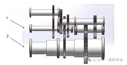數控機床主傳動系統如圖1所示。電動機和齒輪箱利用懸掛點固定于齒輪箱一側構架,電機軸和輸入的小齒輪之間用皮帶連接,兩者之間通過過盈配合方式連接在一起,輸入小齒輪與輸入大齒輪嚙合,輸入大齒輪通過固連接方式連接在軸2。通過軸2的齒輪與其他軸及齒輪進行次級嚙合,經過多次嚙合動力傳遞實現數控機床主傳動系統的低速、中速、高速3種工況。